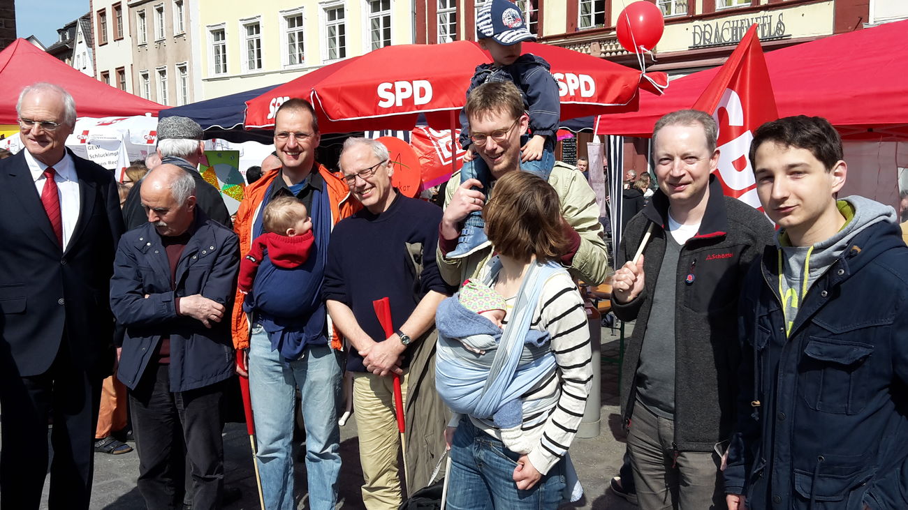 Die Sonne lachte vom Himmel, die roten Fahnen flatterten im Wind. Auch in diesem Jahr nahm wieder eine große Delegation unseres Ortsvereins an der traditionellen Maikundgebung auf dem Heidelberger Marktplatz teil. Um 10.30 Uhr setzte sich der Zug vom Bismarckplatz aus in Gang. Vorneweg mit von der Partie: Lothar Binding, Marlen Pankonin und Willy Edelhoff (aus dem "Malu-Land" Rheinland-Pfalz). Und sechs "Kinder unter sechs", die wir mit pädagogisch sicherer Hand an das Brauchtum der internationalen Arbeiterbewegung heranführten.