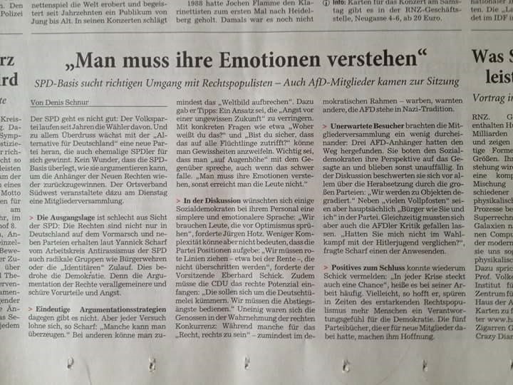 Bericht in der RNZ vom 17.11.2016 Wie konnte es zum bedenklichen Aufstieg der Neuen Rechten in Deutschland, Europa und in den USA kommen? Aus welchen sozialen Gruppen rekrutieren sie ihre Gefolgschaft? Welche Ziele verfolgen sie? Wie ist die aktuelle Situation in Heidelberg?