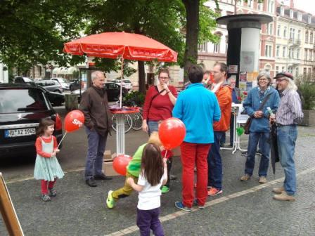 Wahlkampfauftakt auf dem Wilhelmsplatz: Am Samstag, den 10. Mai, verteilten wir an die Marktbesucher*innen ab 11 Uhr unsere Broschüren für den Europa- und Kommunalwahlkampf. Auch die schönen roten Luftballons fanden reißenden Absatz!