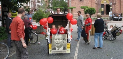 Um 11 Uhr nahm die "Rote Rikscha" am Wilhelmsplatz Fahrt auf Selbst der Himmel hatte ein Einsehen: Nachdem es am Abend zuvor in Heidelberg noch in Strömen geregnet hatte, rissen die Wolken am 16. Mai pünktlich auf. So rollte die mit Luftballons und Fähnchen reich geschmückte „Rote Rikscha“, der mobile Wahlkampfstand des SPD-Ortsvereins Heidelberg-Weststadt, ab 11 Uhr bei herrlichem Sonnenschein durch die Straßen unserer Stadt.