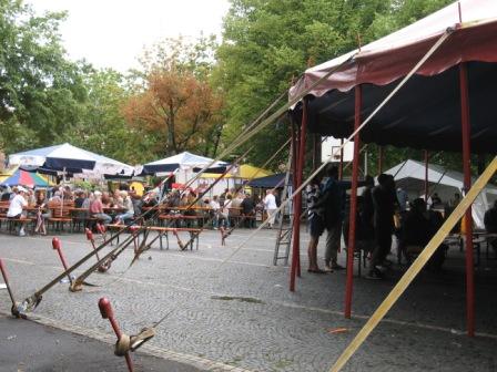 Wieder ein Blickfang: Zelt und Gäste des Sommerspektakels Leckeres vom Grill oder aus der Salatbar, Orangenlimonade in dickbauchigen Fläschchen oder frisch gezapftes Bier, harter Rock oder swingender Dixieland, bunter Kinderflohmarkt oder generationenübergreifendes Stadtteilfrühstück – auch 2011 war für alle Besucherinnen und Besucher des "Sommerspektakels", das zwischen dem 8. und dem 10. Juli stattfand, wieder etwas geboten. Auch wenn Regen und das Achtelfinalspiel der Frauennationalmannschaft die Freude zeitweise eintrübten – es waren wieder drei Tage "Genuss und Gespräch pur".