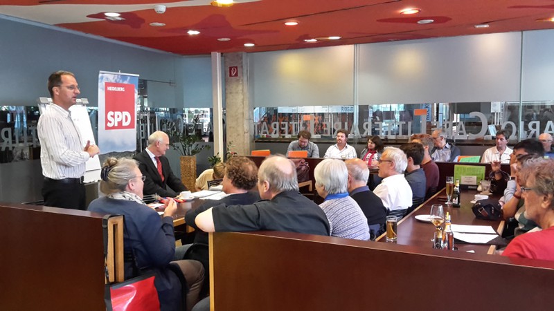 Fast 40 Personen im Literaturcafe: Eberhard Schick bei der Begrüßung Was sind Steueroasen? Wie funktionieren „Briefkastenfirmen“? Welche Möglichkeiten hat die deutsche Politik, hier korrigierend einzugreifen und für mehr Steuerehrlichkeit zu sorgen? Lothar Binding MdB, finanzpolitischer Sprecher der SPD-Bundestagsfraktion, erläuerte uns am 14.7. im "Literaturcafé" die Hintergründe der "Panama Papers". Fast 40 Besucher*innen - eine neue Rekordkulisse für eine Mitgliederversammlung unsers Ortsvereins - folgten gebannt seinen Ausführungen.