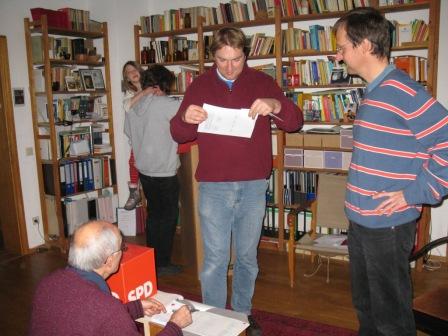 Zwischen 13 und 16 Uhr konnten an diesem Tag alle Mitglieder unseres Ortsvereins in der Wohnung von Uschi und Alex Füller ihre Stimmzettel abgeben. 14 Genossinnen und Genossen nutzten diese Gelegenheit - und wurden anschließend mit köstlichem Kuchen, Kaffee und Tee bewirtet. Um kurz nach 16 Uhr zählte der Wahlvorstand die 14 Stimmzettel aus und meldete das Ergebnis telefonisch an das Parteibüro: Auf die Ulmerin Hilde Mattheis entfielen 8 Erststimmen (57,1%), auf die Württemberger Nils Schmid und Claus Schmiedel jeweils 3 Erststimmen (jeweils 21,4%). Das Endergebnis im gesamten Land, auch unter Einschluss der Briefwähler, sah ganz anders aus: Bei 18.353 abgegebenen gültigen Stimmzetteln entfielen auf Hilde Mattheis 5.341 Stimmen (29,1 %), auf Nils Schmid 8.481 Stimmen (46,2 %) und auf Claus Schmiedel 4.192 Stimmen (22,8 %).